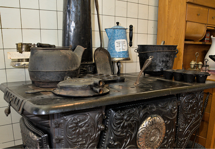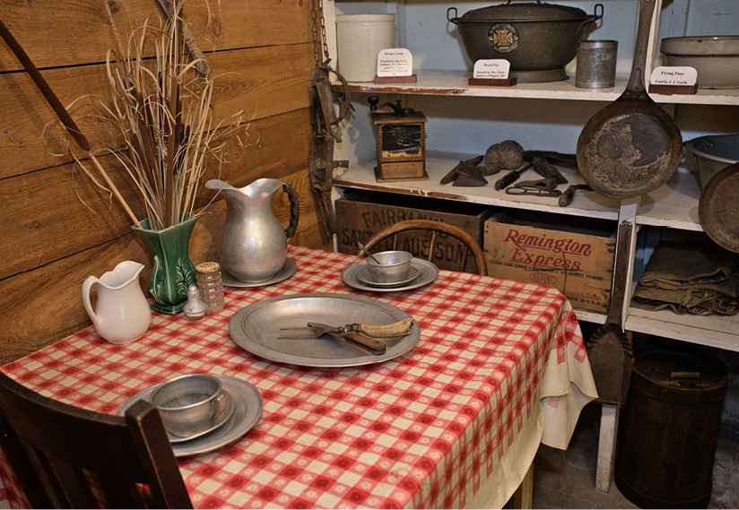 The Pantry houses a 1950’s era refrigerator and our collection of cook books in addition to many of the types of pots and pans that were used by our ancestors.  It is located just off the Kitchen to the east.