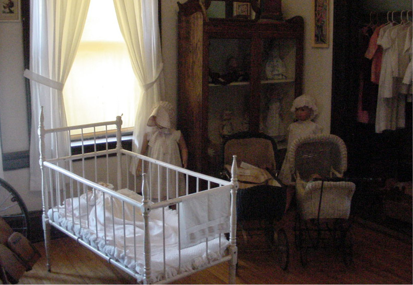 The Doll room is on the third floor to the right of the stairs.  It is the only bedroom in the house that is without any embellishment, no fancy molding, no fancy plaster treatments.  We believe it was the servants’ quarters.  It would have been the hottest room in the summer, the coldest room in the winter and may have been shared by more than one servant.