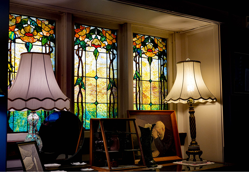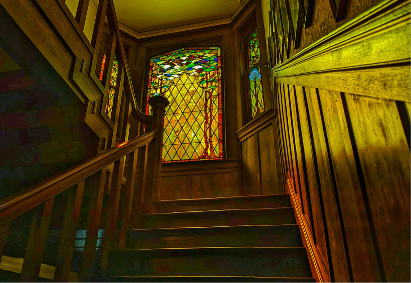 The foyer includes the grand stairway to the second floor with the very large stained glass window on the landing.  There is also a small alcove beneath the stairs that may have been used as a sitting area for workmen or trades people that had business with the family.  Invited guests would have been seated in the Sitting Room (Music Room) or Parlor for quiet conversation.