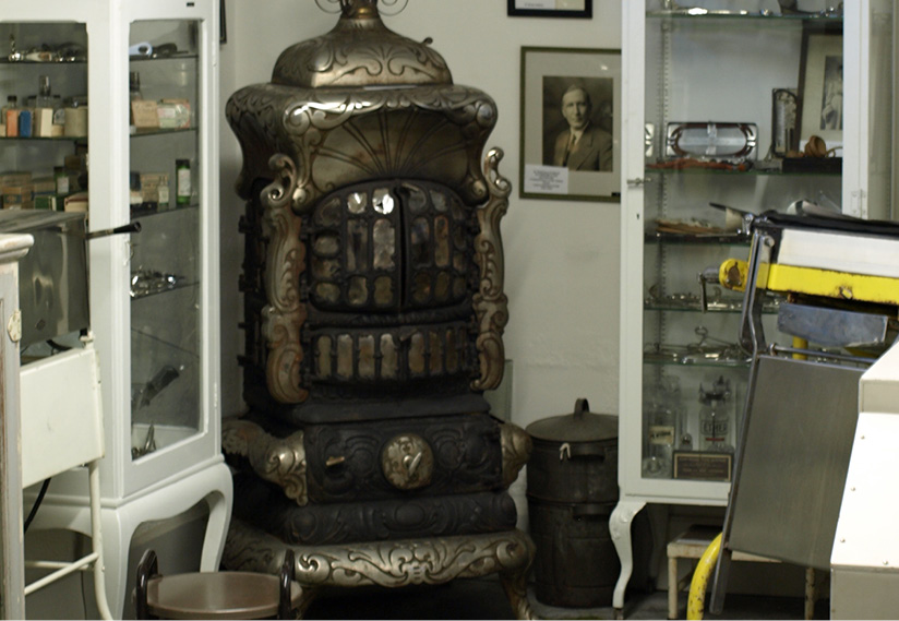 The Medical Room is located in the basement (first room on the right).  It is home to several cabinets of old medical equipment, several examining or treatment tables.  One of our prized pieces is displayed here, the first incubator used at Jamestown Hospital, it is a marvel of design simplicity and functionality.  There are also many pictures of early doctors in Jamestown and Stutsman County.