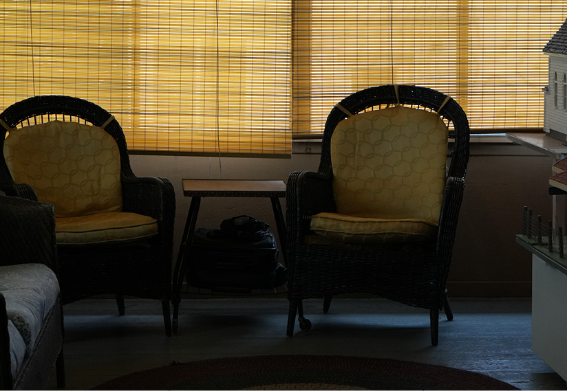 The Front Porch was an open verranda during the time the Lutz family lived here.  When it became a home for the aged it was enclosed and used as extra space in the spring, summer and fall.  It was likely very cold during the winter due to the large window area and lack of insulation. It currently houses our collection of model buildings; including the Otter Tail Power Plant, Northern Pacific Depot and Railway Park Gazebo all constructed by Miles Jensvold; the Church constructed by Simmon Graves and the model of the Jamestown Hospital created to show the latest remodel plan.