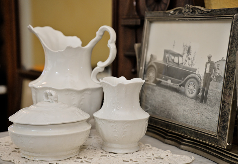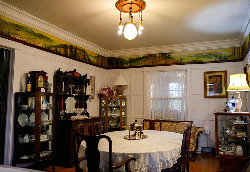 The Dining Room displays much of the fine china in our collection in several elegant hutches and china cabinets.  The room is dominated by a very large oval table probably very similar to the one used by the Lutz family when they resided here in the early 1900’s.