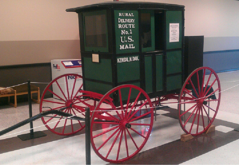 The Carriage House set behind the museum (East).  It houses the mail wagon and is used for storage of other artifacts that are not currently displayed. The horse drawn mail wagon pictured was used at Kensal, ND. It has a built in coal stove, but no insulation