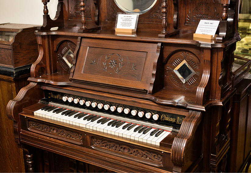 The Music Room is located just off the foyer, it was probably used as a Sitting Room by the Lutz family for quiet conversation with guests prior to a meal or other activity.  It currently houses much of our musical collection including square grand and upright pianos and several pump organs. A ukelin, dulcimer and harpsicord are also displayed here.  The room is also home to an Edison cylinder phonograph and a hand wound 78 rpm disk phonograph.