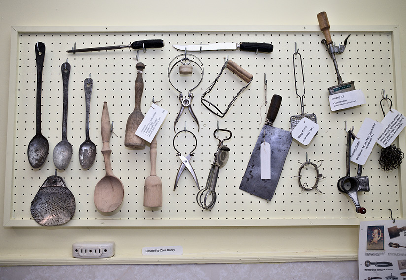 The Kitchen houses a coal burning kitchen range and a stand alone cupboard.  The laminate counter on the north wall was surely added during the time it was used as a home for the aged, as were the linoleum wall coverings.  They were probably added at the insistance of health inspectors.  It is the only room in the house with tile floors (in a checkerboard pattern) typical of the style of the forties and fifties.  Although there are food preparation items spread throughout the museum, some of the more unique items are displayed here.