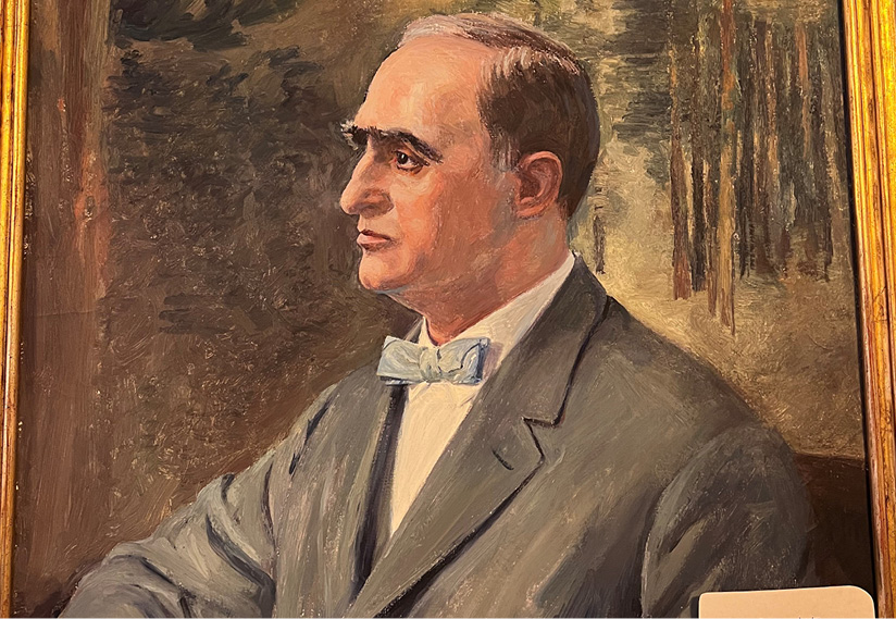 This room is to the right of the foyer and houses a great deal of memorabila.  The collection here ranges from hair combs to cigar lighters and from eye glasses to antique dresses and hats. The plaster treatments in this room are unique, it houses the grand fireplace with a painting of George Lutz on the mantle.  Mr. Lutz was a prominent Jamestown and Stutsman County lumber dealer, he built the mansion and lived here from 1907 until his death in 1929.